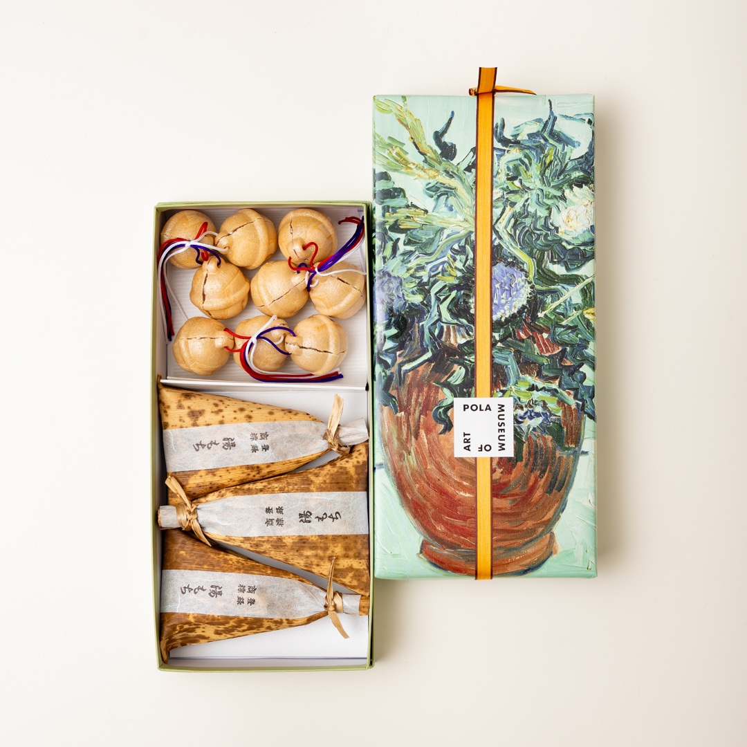 ゴッホ《あざみの花》パッケージ「湯もち・八里」(1,910円)は、火曜・木曜・土曜の13時半頃以降に入荷。数量限定のため、なくなり次第終了となる。